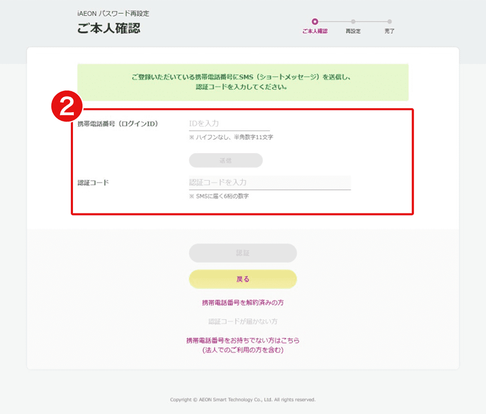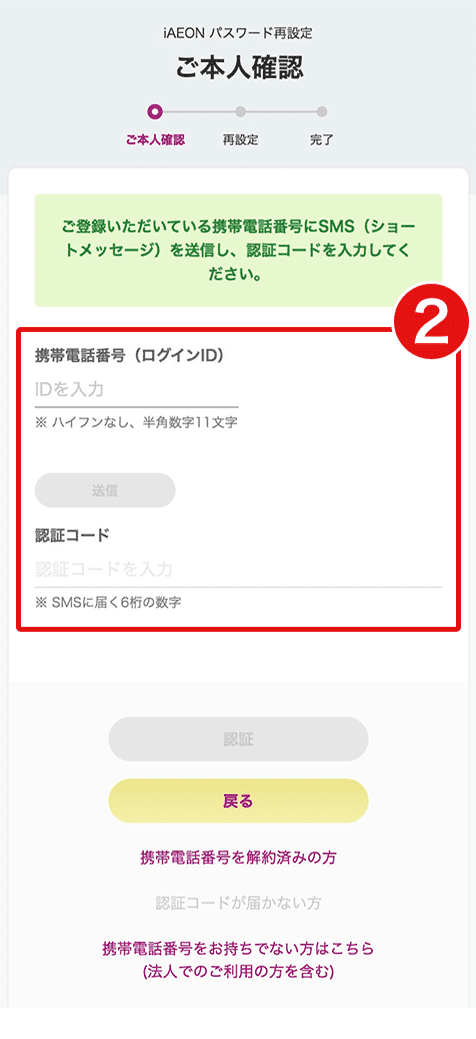 ご登録番号に送付された認証コードを入力し、「認証」をタップしてパスワードの再設定をお願いします。