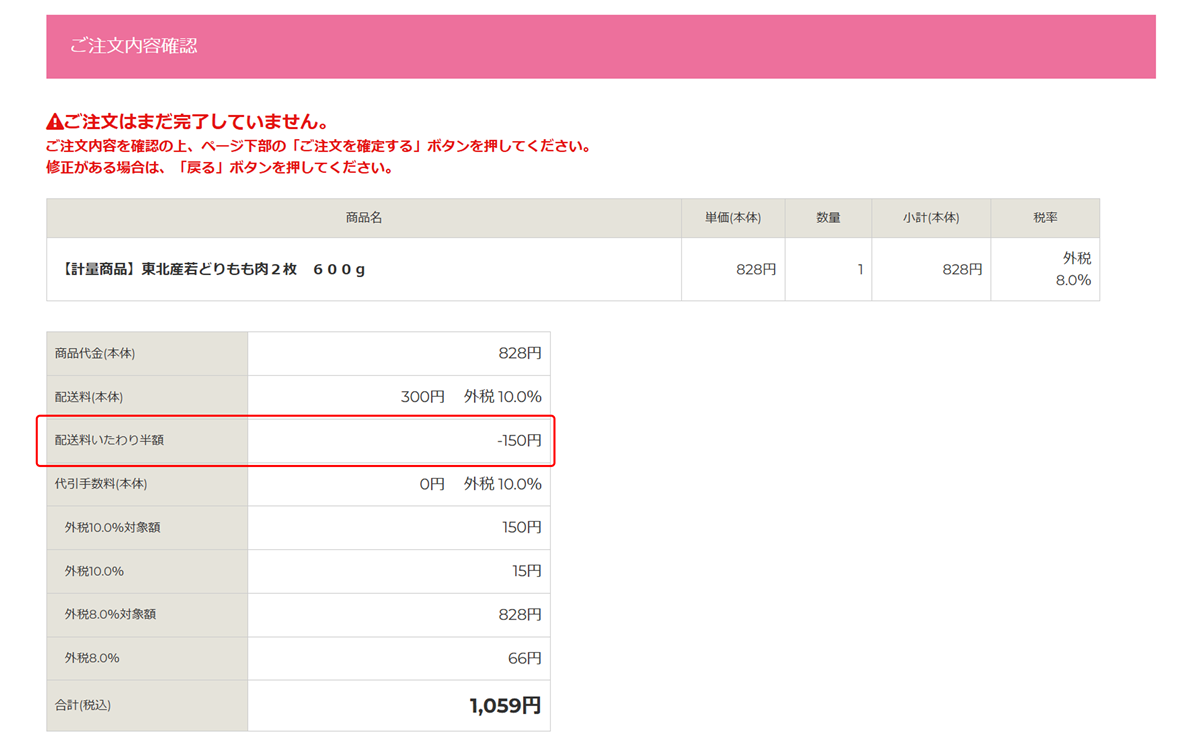 ご注文内容確認画面に ご注文手続き画面で選択したクーポンの情報が表示されます。