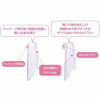 歯がはえる前~奥歯がはえ始めるまでのベビーに。マッサージ用指サックでマッサージすると、お口を開けてくれやすくなります。前歯用指サックは波状模様で唇が止まり、みがきやすい設計です。組成(原材料名:素材)シリコン原産国 中国