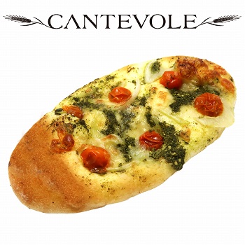 もっちり食感の生地にトマトとスライスオニオンをトッピングし焼き上げました。バジルソースがアクセント※店内で焼きあげました。